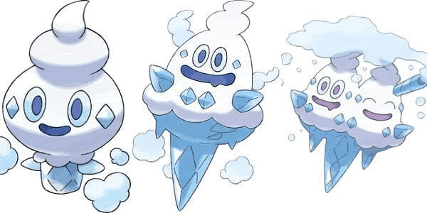 Vanillite. Se asemeja a una bola de helado con una cubierta de nieve, y al igual que sus evoluciones parecen a un helado de cono sencillo o doble.
