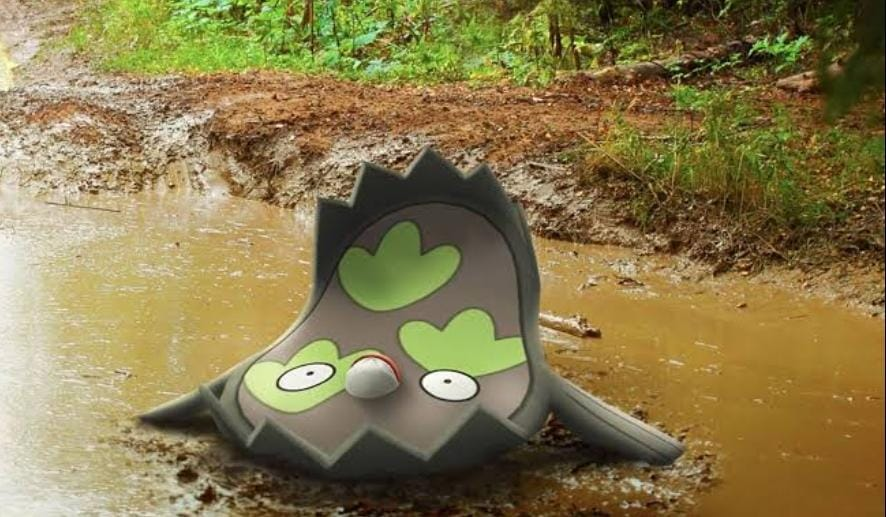 Stunfisk de Galar. tiene un diseño basado en una trampa de oso y muchos hemos caído en sus garras a lo largo de la aventura pensando que era un objeto.