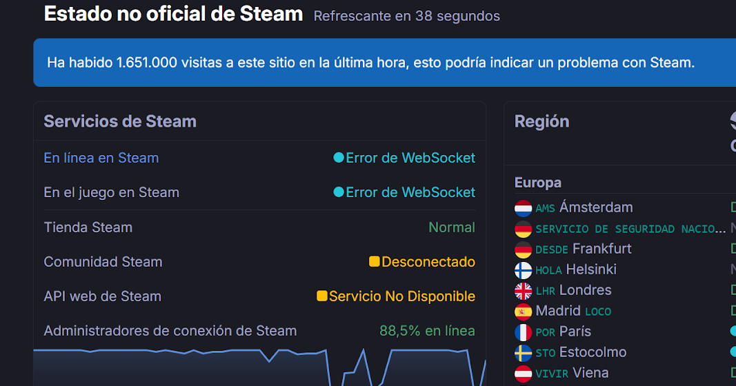 - 🔴 Rojo (Problemas mayores): El servicio está caído o con fallos graves. No intentes solucionar nada en tu PC, el problema es de Steam y solo debes esperar a que “Valve” (empresa creadora) lo resuelva.