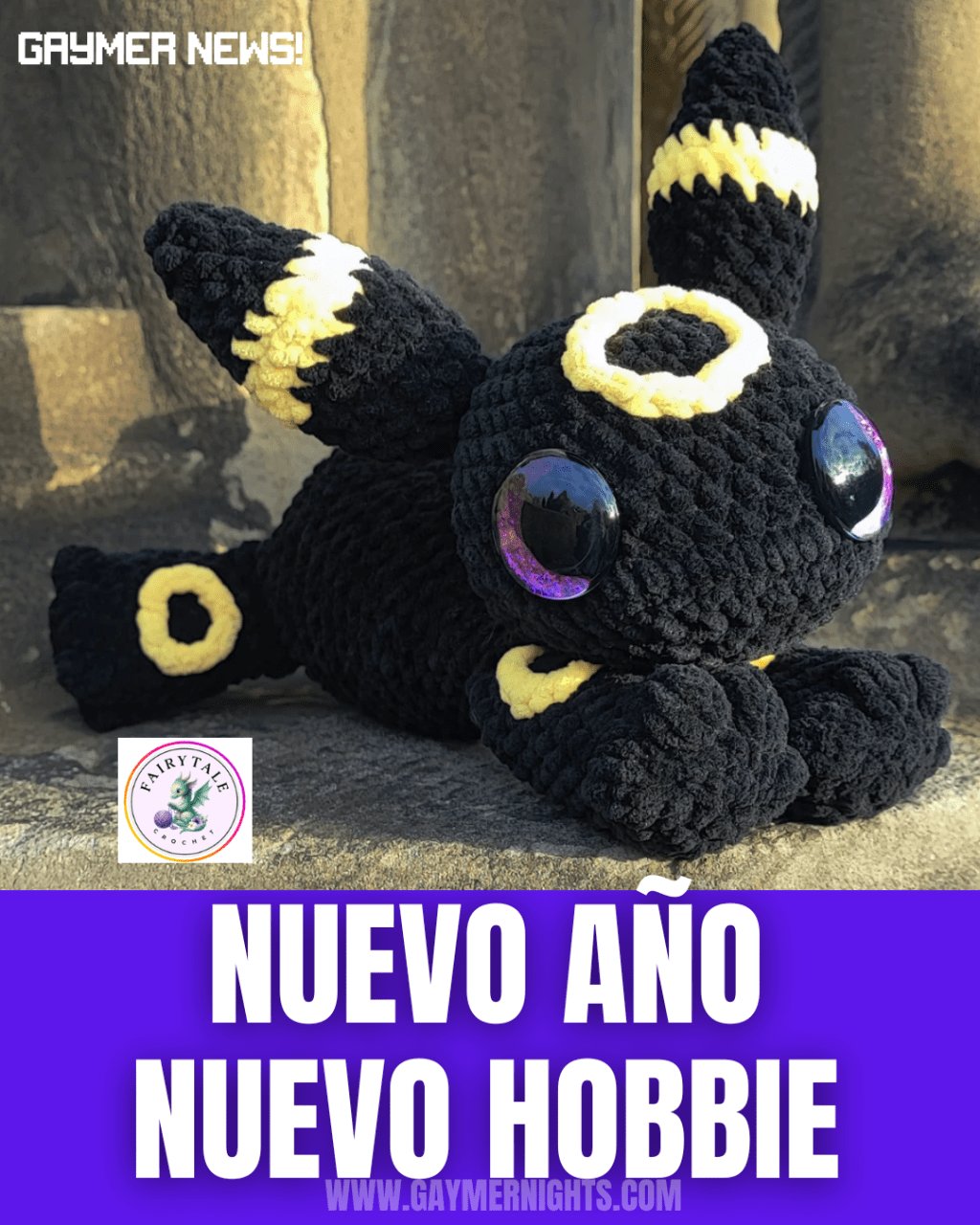 Un detalle que ha cautivado a los fans son los ojos: grandes, brillantes y de un color púrpura profundo que parece darle vida propia al Pokémon. En los juegos, Umbreon es un tipo Siniestro que destaca por su resistencia y lealtad, y esta versión tejida logra capturar esa esencia protectora pero tierna.